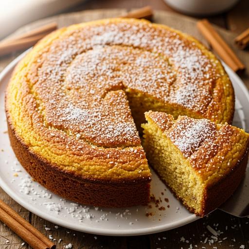Um bolo úmido e aromático, perfeito para um café da tarde ou lanche, combinando o sabor do fubá com a doçura do coco e a calidez da canela.