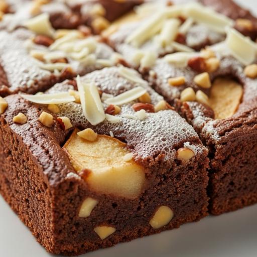Um brownie irresistivelmente úmido, com pedaços crocantes de maçã, nozes e raspas de chocolate, trazendo um clima aconchegante e festivo, perfeito para a ceia de Natal e a celebração de Ano Novo.