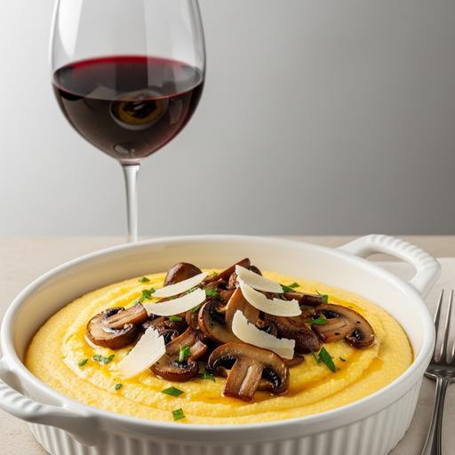 Polenta cremosa com funghi e parmesão, um prato italiano adaptado ao paladar brasileiro, suave, aromático e reconfortante.