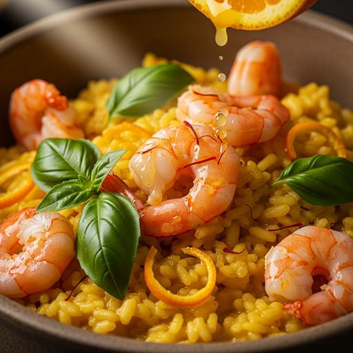 Em uma panela, aqueça azeite e doure a cebola e alho picados. Adicione o arroz e refogue por 2 minutos. Deglace com suco de laranja e vinho branco. Junte lentamente o caldo quente, mexendo constantemente até a mistura ficar cremosa. Tempere com sal e pimenta. Adicione camarões cozidos, laranja ralada e manjericão fresco. Misture bem e finalize com manteiga e queijo parmesão ralado. Served imediatamente em pratos quentes.
