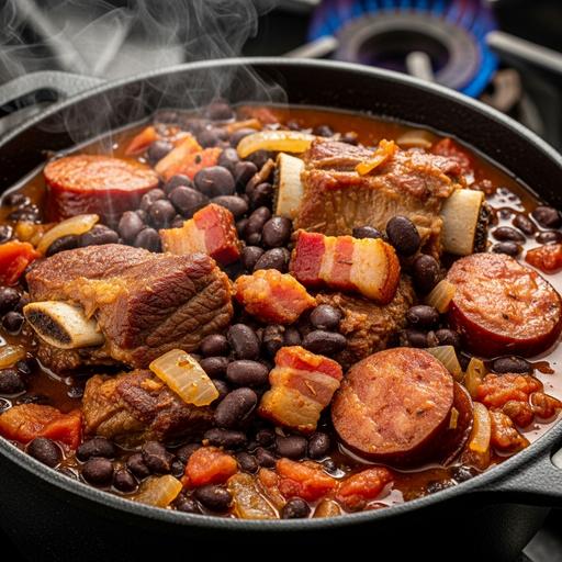 Uma refeição rica e saborosa, perfeita para dias frios, com carne de porco, bacon e linguiça em molho de feijão preto.