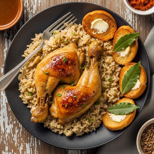 Uma receita reconfortante de frango cozido lentamente com arroz de forro, servido com torradas crocantes, típica da culinária caseira brasileira.