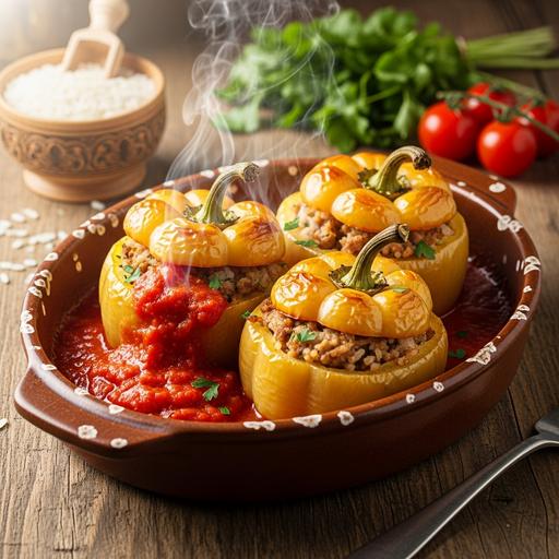 Receita reconfortante de pimentões recheados com carne moída, arroz e molho de tomate, perfeita para almoços em família. Deliciosa e saborosa.