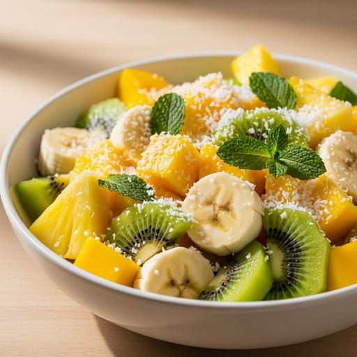 Descasque e corte a abacaxi, manga e banana em cubos pequenos. Adicione ao recipiente os pedaços de coco ralado e as fatias de kiwi. Misture suavemente com as raspas de lima e o suco fresco. Sirva gelado, decorado com folhas de hortelã.