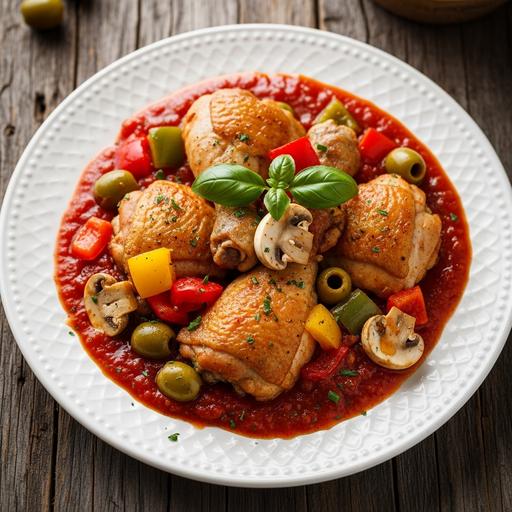 Em uma tigela, misture o frango com azeite, alho, orégano, tomilho e sal. Deixe marinar por 30 minutos. Em uma panela grande, refogue a cebola picada e os pimentões cortados em cubos. Adicione o frango e doure em todos os lados. Junte os tomates pelados em cubos, as ervas frescas, as azeitonas e os cogumelos. Deixe cozinhar em fogo baixo por 30 minutos, mexendo ocasionalmente. Finalize com azeitonas verdes e regue com um fio de azeite antes de servir.
