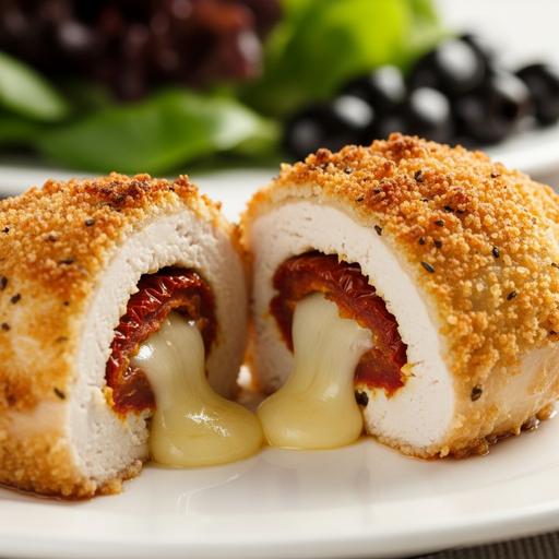 Receita clássica brasileira com frango suculento recheado com queijo derretendo e tomate seco, combinando sabor e aroma em cada garfada.