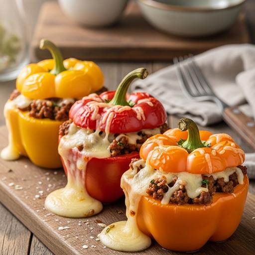Comece cozinhando 1 xícara de arroz em água salgada até o ponto al dente. Em uma panela, refogue 1 cebola picada e 2 dentes de alho em óleo até dourar. Adicione 300g de carne moída e cozinhe até dourar bem. Misture 1 lata de molho de tomate, 1 colher (sopa) de açafrão, sal e pimenta a gosto. Desligue o fogo e incorpore o arroz cozido. Corte 4 pimentões em dois, retire as sementes e recheie com a mistura. Cubra com papel alumínio e asse em forno pré-aquecido a 180°C por 30 minutos. Retire o alumínio, espalhe queijo ralado por cima e asse mais 10 minutos até dourar.