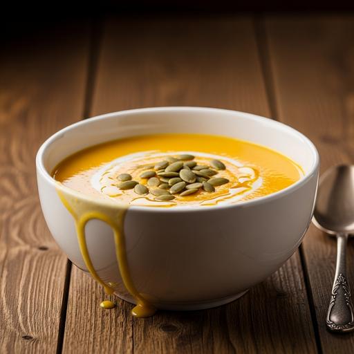 Para preparar a sopa, primeiro corte a abóbora em cubos e leve ao forno com azeite, sal e pimenta até dourar. Em uma panela, refogue cebola e alho até transparente. Adicione o caldo vegetal e os cubos de abóbora cozidos. Bata tudo no liquidificador até obter uma mistura homogênea. Retorne à panela, acrescente a leite de coco e as especiarias. Deixe cozinhar por mais 10 minutos em fogo baixo, mexendo ocasionalmente. Sirva quente, polvilhado com sementes de abóbora tostadas.