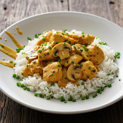 Corte peito de frango em cubos pequenos e tempere com sal, pimenta e uma colher de farinha de trigo. Em uma panela, derreta manteira e refogue cebola picada e alho amassado. Adicione cogumelos fatiados e cozinhe até murchar. Misture a creme de cebola, uma lata de creme de cogumelo e meia xícara de leite. Cozinhe em fogo médio até engrossar. Retire do fogo e incorpore 2 colheres de sour cream e um ovo cozido. Sirva com arroz branco.