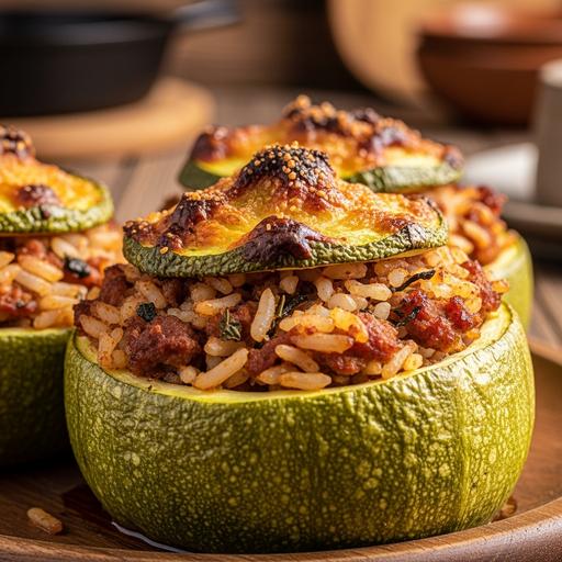 Receita saudável e saborosa que combina abobrinha recheada com um delicioso arroz misturado a carne moída, ideal para quem busca uma opção leve mas completa. Fácil de preparar e cheia de sabor!