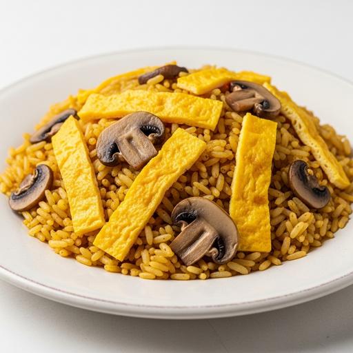 Comece fritando a cebola e o alho no azeite até dourar. Adicione o arroz e refogue por 2 minutos. Misture o caldo de legumes e cozinhe até o arroz ficar al dente. Em uma panela separada, bata os ovos com um garfo, misture os cogumelos fatiados, o queijo ralado e tempere com sal e pimenta. Derreta a manteiga em uma frigideira, adicione a mistura de ovos e cozinhe até formar uma crepe. Corte o crepe em tiras e misture ao arroz. Finalize com o creme de leite e as folhas de salsinha.