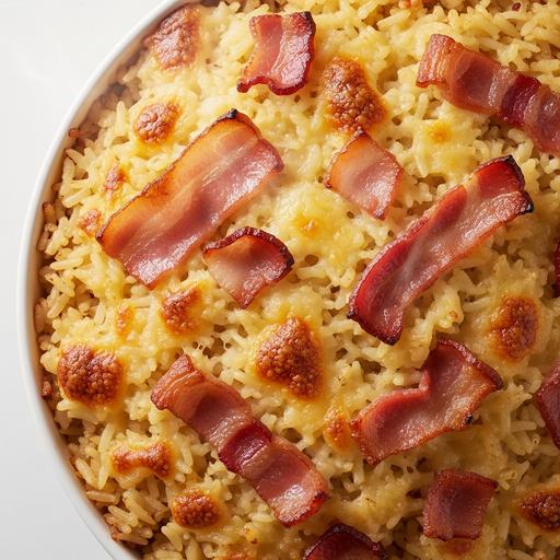 Em uma panela, cozinhe o arroz em água até estar al dente. Em uma tigela, misture o arroz cozido com leite morno, manteiga, creme de cebola e ovos batidos. Tempere com sal e pimenta. Transfira para uma forma untada e cubra com queijo ralado e bacon em rodelas. Leve ao forno preaquecido a 180°C por 30 minutos, ou até dourar. Sirva quente com uma salada verde.