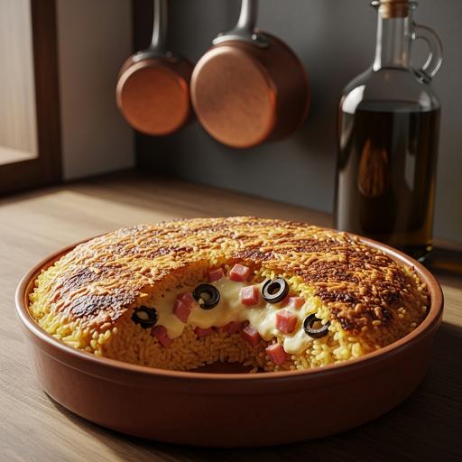 Cozinhe 1 xícara de arroz em panela grande até ficar al dente. Em outra panela, frite 2 colheres de manteiga e 200g de carne moída até dourar, tempere com sal, pimenta e 1 cebola ralada. Em um recipiente, bata 4 ovos com 1/2 xícara de leite e 1 colher de farinha de trigo. Misture o arroz cozido com 100g de queijo ralado, 50g de presunto cortado em cubos e 50g de azeitonas verdes. Unte uma forma redonda com manteiga, coloque uma camada da mistura de carne, depois o arroz com ingredientes e finalize com a mistura de ovos. Leve ao forno preaquecido a 180°C por 25 minutos ou até dourar. Deixe esfriar por 10 minutos antes de servir.