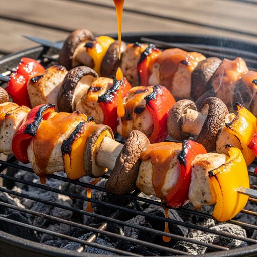 Receita quick e saborosa de frango grelhado em espetos, com molho barbecue caseiro e temperos aromáticos.