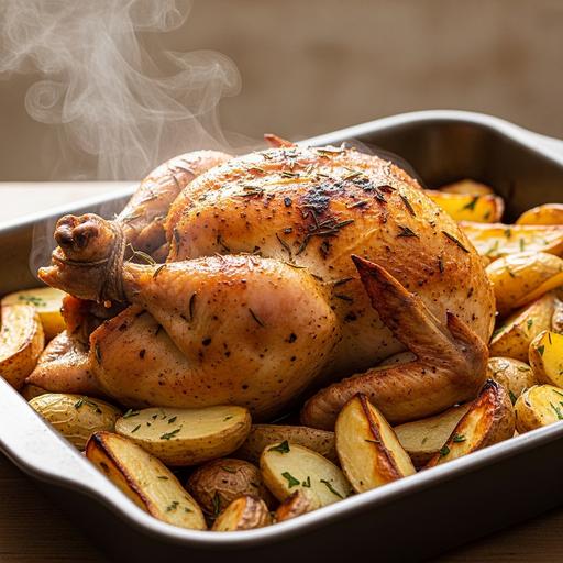 Dica do Chef: Para substituir as batatas, use batata doce ou cenouras fatiadas finas. Para carne mais suculenta, marinar o frango por 2 horas com limão e ervas antes de assar.