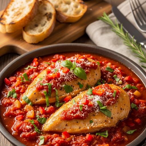 Tempere pedaços de frango com sal, pimenta-do-reino e azeite. Refogue alho e cebola em uma panela, adicione o frango e dourar. Acrescente pimentões vermelhos em cubos, tomates picados, molho de tomate, manjericão fresco e água. Cozinhe em fogo baixo por 30 minutos, mexendo ocasionalmente. Finalize com queijo parmesão ralado e ervas frescas.