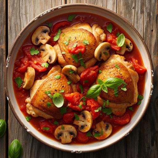 Receita clássica italiana com frango assado em molho ricamente aromatizado, combinando cogumelos, tomates e ervas mediterrâneas.