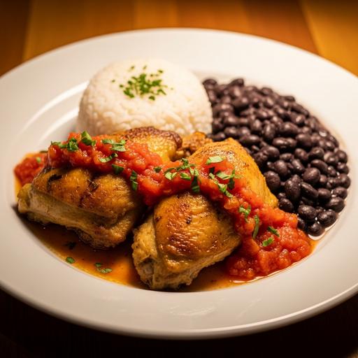 Comece preparando o frango caco: corte 1kg de peito de frango em cubos pequenos e tempere com 2 dentes de alho picados, 1 colher de sopa de azeite, sal e pimenta a gosto. Em uma panela, aqueça o azeite e doure o frango por 5 minutos. Adicione 1 cebola picada e deixe dourar. Misture 3 tomates sem pele e picados, 1 colher de sopa de catchup, 1 colher de sopa de molho inglês e 1 colher de sopa de páprica. Cozinhe por 20 minutos, mexendo ocasionalmente, até o molho engrossar. Enquanto isso, prepare o arroz cozido com 1 xícara de arroz e água. Para o feijão preto, cozinhe 1 xícara de feijão em 3 xícaras de água com 1 cebola e 2 dentes de alho até ficar cremoso. Sirva o frango caco acompanhado do arroz e feijão, polvilhado com orégano fresco.