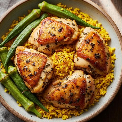Prato tradicional brasileiro com frango suculento, quiabo crocante e arroz sequinho, perfeito para almoço em família.