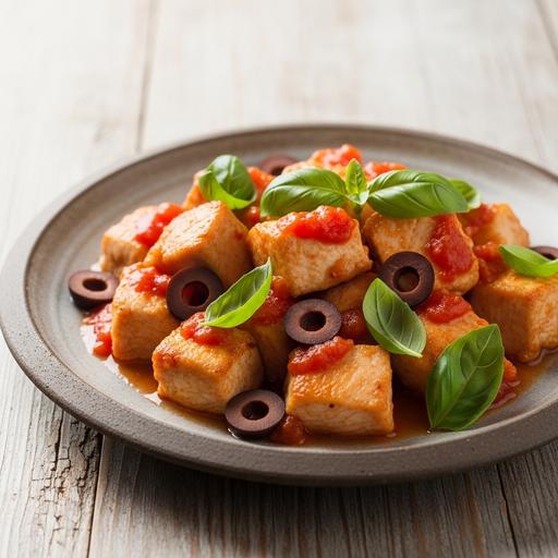 Para preparar o frango, corte os peitos em cubos pequenos e tempere com sal, pimenta-do-reino e azeite. Em uma panela aquecida, doure o frango em fogo médio até dourar levemente. Adicione a cebola picada e o alho amassado, refogando até murchar. Em seguida, inclua os tomates pelados em cubos e o molho de tomate, deixando cozinhar por cerca de 10 minutos. Junte o manjericão fresco e o orégano, tampe a panela e deixe apurar por mais 15 minutos em fogo baixo. Para finalizar, incorpore as azeitonas pretas e mantenha em fogo baixo por 5 minutos, garantindo que os sabores se unam perfeitamente.
