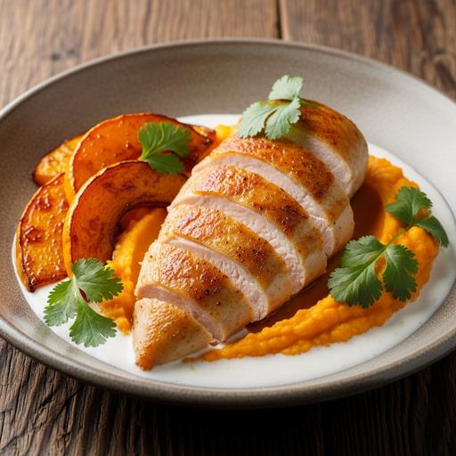 Uma combinação deliciosa e exótica de frango suculento com molho de coco cremoso, servido sobre purê de mandioca. Ideal para apreciadores de sabores tropicais e texturas suaves.