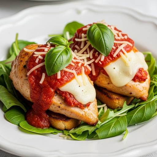 Preaqueça o forno a 180°C. Corte os peitos de frango ao meio no sentido do comprimento, abrindo-os como um livro sem cortar totalmente. Misture o molho de tomate com folhas de manjericão fresco e uma colher de sopa de açúcar. Recheie os frangos com fatias de mussarela e queijo parmesão, depois cubra com o molho de tomate preparado. Tempere com alho picado, azeite, sal e pimenta a gosto. Asse por 30 minutos ou até dourar. Sirva com arroz branco e folhas de salsinha fresca.