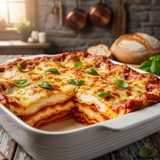 Uma lasanha clássica e saborosa, recheada com molho de carne, presunto e queijo, levemente picante e com um toque de orégano.
