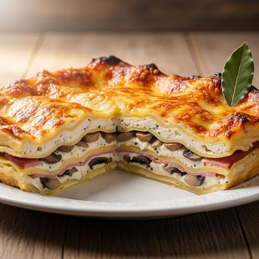 Uma lasanha tradicional com molho branco, frango desfiado e presunto, gratinada com queijo parmesão. Saboroso, reconfortante e perfeito para refeições em família.
