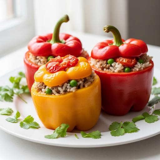 Lave os pimentões e retire as sementes. Em uma panela, refogue a cebola e o alho em azeite. Adicione a carne moída e cozinhe até dourar. Misture o arroz, o tomate, o molho de tomate, o feijão verde e as ervilhas. Tempere com sal, pimenta e cheiro-verde. Cozinhe por 10 minutos até o arroz ficar cremoso. Preencha os pimentões com a mistura e cubra com água quente. Leve ao forno pré-aquecido a 180°C por 30 minutos ou até os pimentões estarem crocantes e dourados.