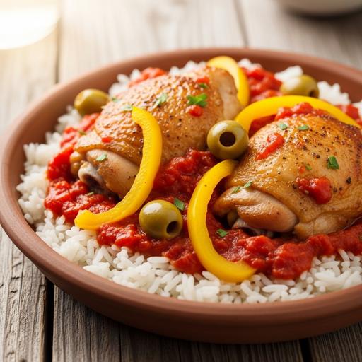 Preaqueça o forno a 180°C. Tempere as coxas de frango com alho, tomilho, alecrim e sal. Em uma panela, aqueça o azeite e doure a cebola e os pimentões. Adicione os tomates cortados, as azeitonas, o vinho branco e o molho de tomate. Deixe reduzir por 10 minutos. Coloque as coxas de frango na panela e leve ao forno por 30 minutos. Retire o frango, reduza o molho por mais 10 minutos e sirva sobre arroz branco.